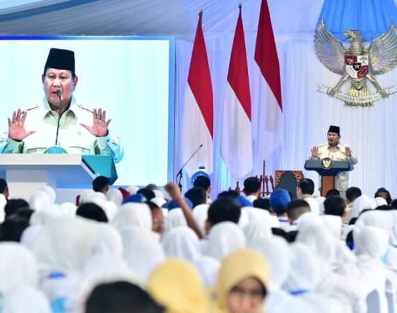 Ribuan pelajar memenuhi Jalan Komodo Raya menyambut Presiden Prabowo dalam agenda peluncuran Smartboard dan digitalisasi pendidikan di Kota Bekasi Kota...